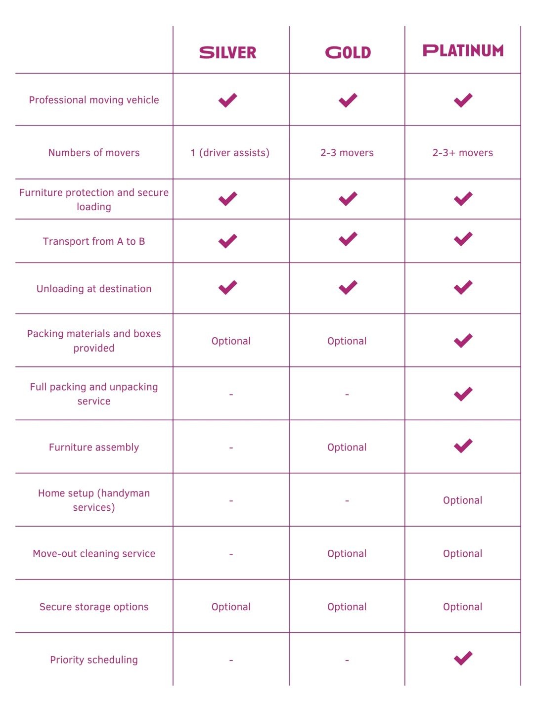 Saad täiustada mis tahes paketti — eriti Silverit või Goldi — meie lisateenuste valikuga, alates eluaseme otsingu abist kuni kolimisjärgse koristuse ja turvalise ladustamiseni.